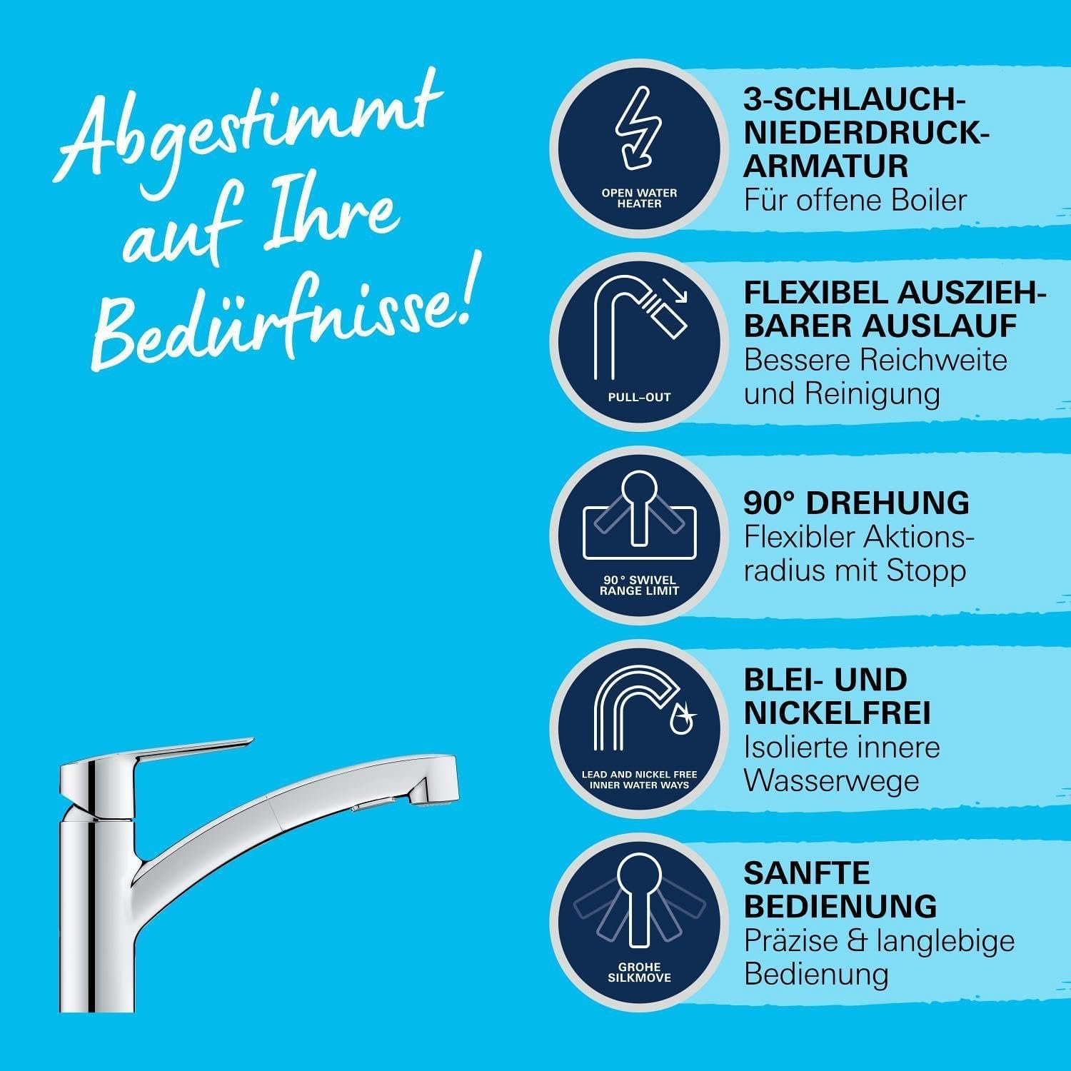 Wenn Sie eine Niederdruck-Armatur suchen, die maximale Flexibilität am Spülbecken bietet, Wasser spart und sich dank des cleveren Montagesystems überraschend einfach installieren lässt, ist die GROHE Start in Chrom die perfekte Wahl.
